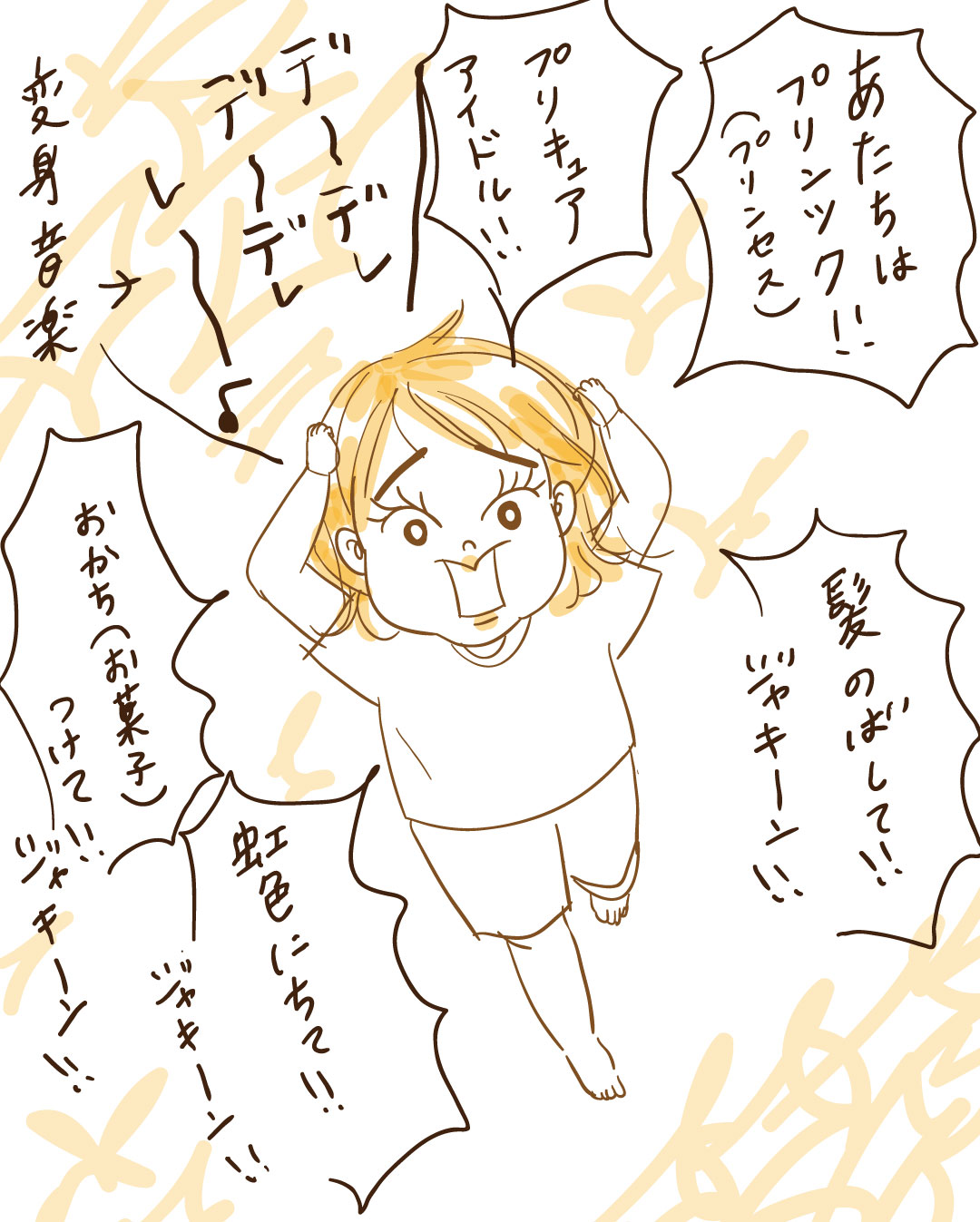大好きなプリキュア、髪伸びるとか言語化して変身中(お菓子はつけないと思うよ)